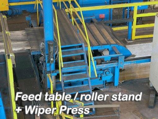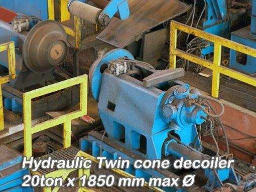 - Cold strip slitting machine - Installed 1997 1500 mm x 10 mm max comprising (St 37) 3 position coil loading table with hydraulic coil transfer car Hydraulic twin cone uncoiler with peeler and snubber roll Max coil weight 25 tonnes, 2000 mm max O.D. Feed and levelling roll stand (5 rolls Ø 200mm) DAC hydraulic shear (10 mm max) Slitting stand with feed rolls and slitter guides, 2 removable slitting stands (quick change) with driven arbors, shimless tooling system for 15 mm to 12.5 mm wide tools Max slitting speed 75m/min 2 scrap balers with twin cone coilers and scrap discharge conveyor (hydraulic opening) Loop pit or feed table, feed roller stand with cutting Shear 1500x10mm Hydraulic feed rolls and shear (10 mm) Two roll feed and hydraulic positioning table 20" recoiling mandrel with 150 HP drive (and spare motor), push off unit transfer car and unloading Capstan Hydraulic power pack Slithead: 30 kW (400V) Decoiler + Straightener ( hydraulic Driven): 50 kW (400V)