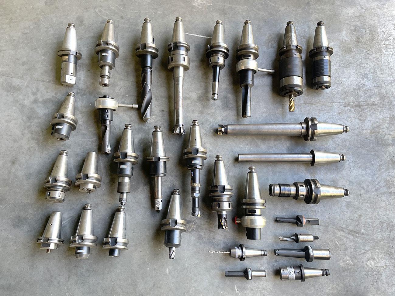 w tym wiele narzędzi frezarskich + akcesoria zaciskowe (3 imadła, 1 imadło obrotowe, bloki zaciskowe,...)