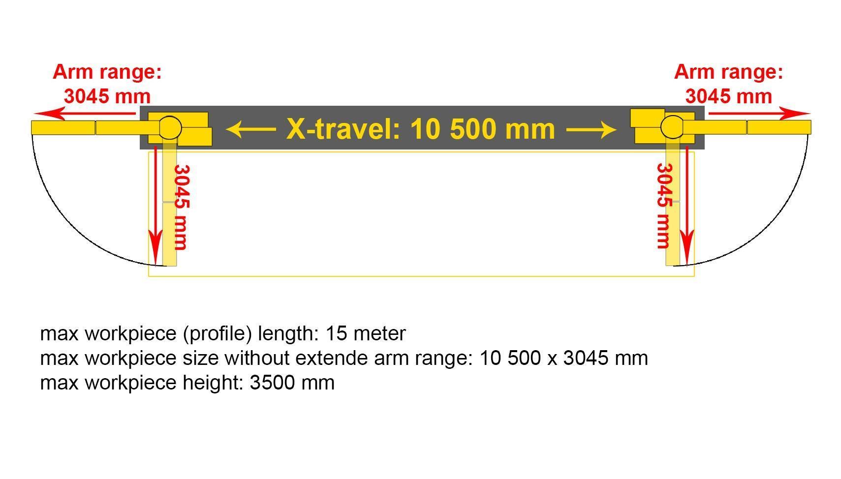 > maks. rozmiar przedmiotu obrabianego bez wysuwanego ramienia: 10 500 x 3045 mm